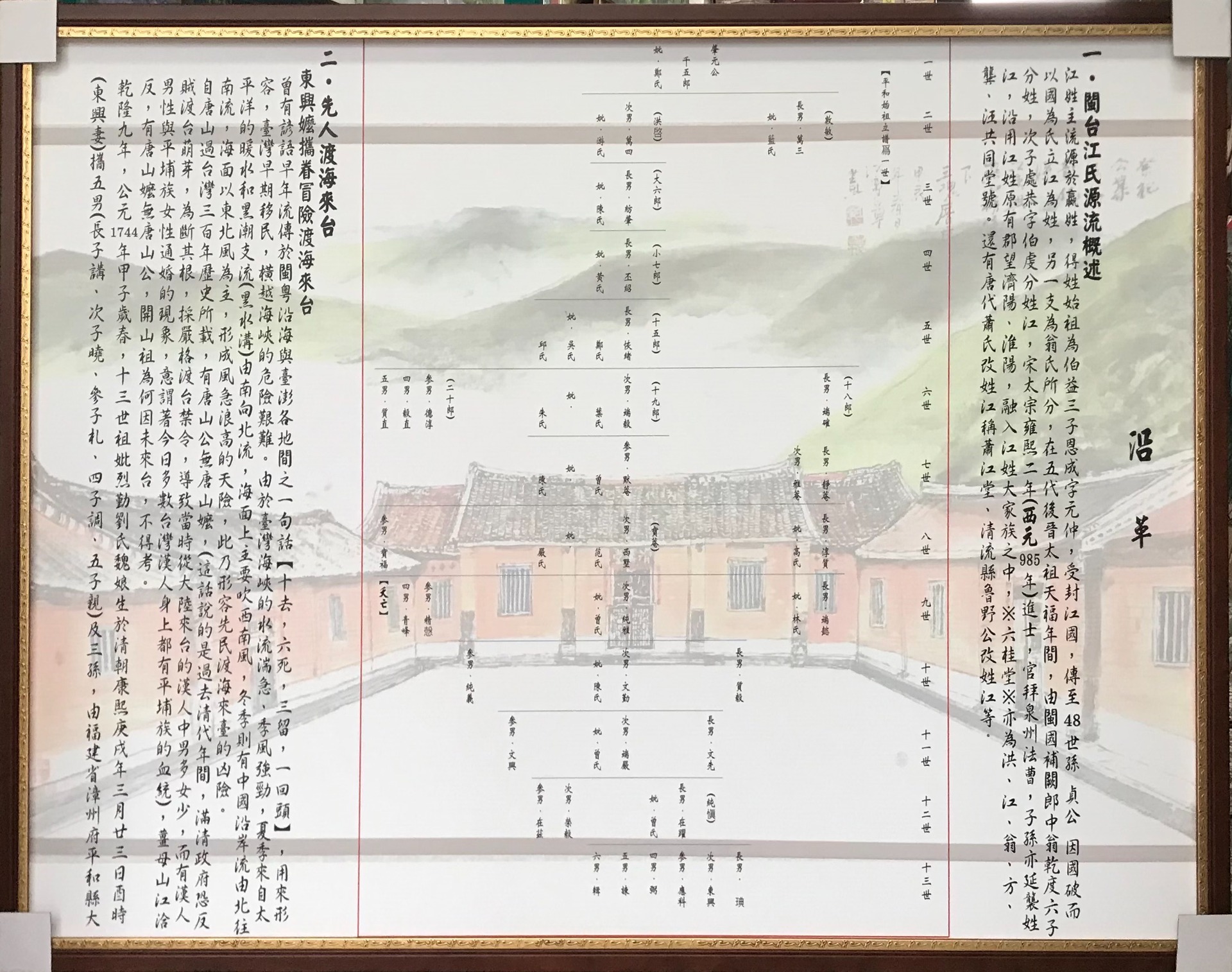 江姓主流源於嬴姓,得姓始祖為伯益三子恩成字元仲,受封江國,傳至48世孫 貞公 因國破而以國為氏立江為姓,另一支為翁氏所分,在五代後晉太祖天福年間,由閩國補闕郎中翁乾度六子分姓,次子處恭字伯虔分姓江,宋太宗雍熙二年(985年)進士,官拜泉州法曹,子孫亦延襲姓江,沿用江姓原有郡望濟陽、淮陽,融入江姓大家族之中,※六桂堂※亦為洪、江、翁、方、龔、汪共同堂號。還有唐代蕭氏改姓江稱蕭江堂、清流縣魯野公改姓江等。